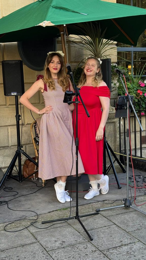 Providing music and songs were the D-Day Dollies duo who entertained the crowds with their vintage-style musical performances at the entrance to The Ivy restaurant in The Mall.