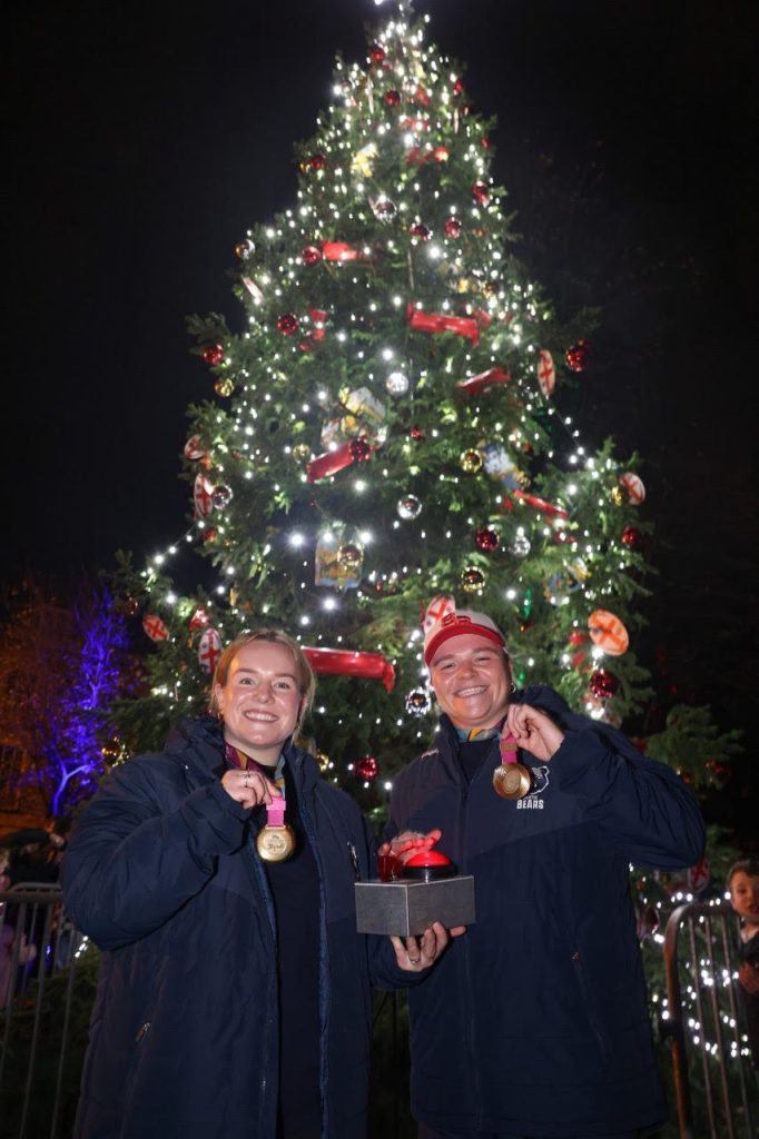 Hundreds of people turned out to see two players from England’s Red Roses rugby team switch on the lights of the Christmas tree in Clifton Village.