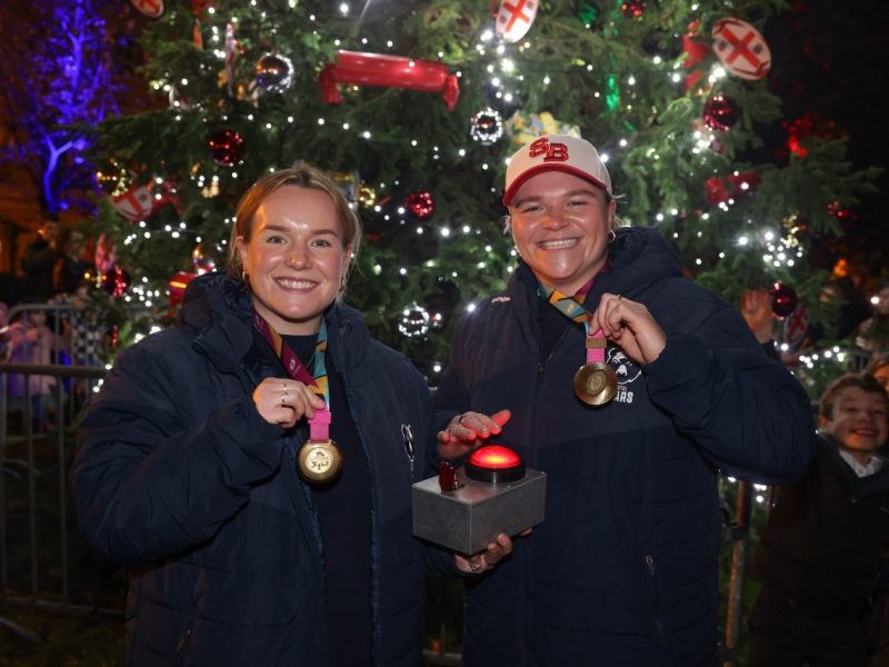 Hundreds of people turned out to see two players from England’s Red Roses rugby team switch on the lights of the Christmas tree in Clifton Village.